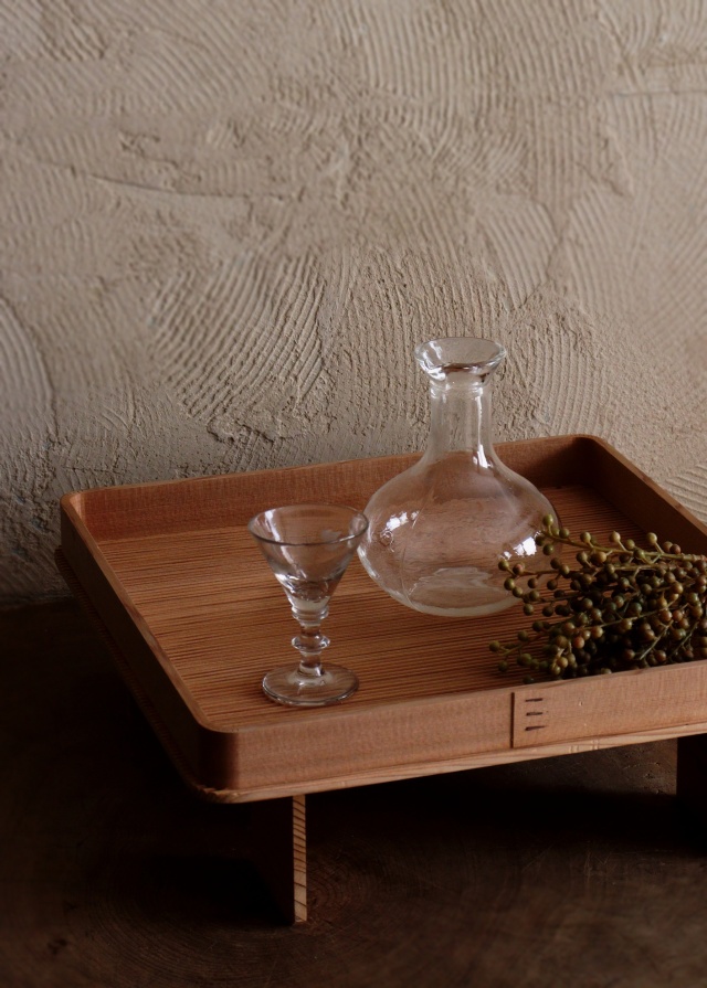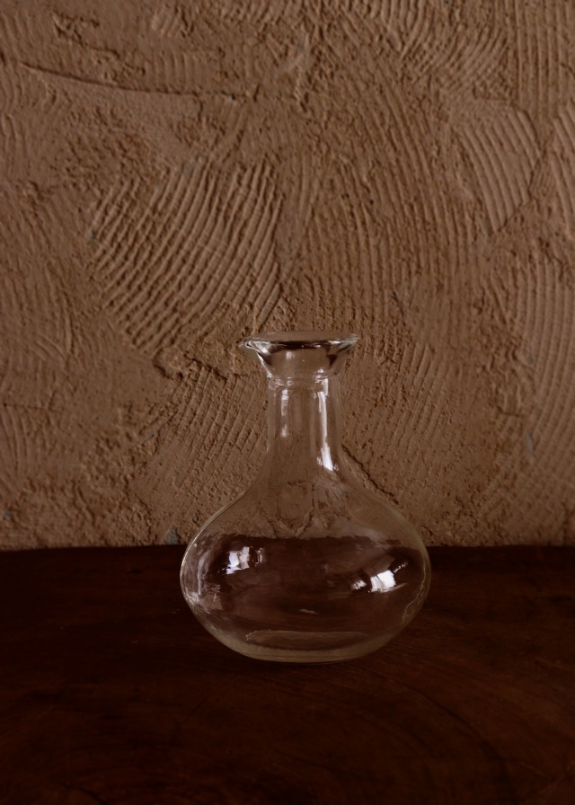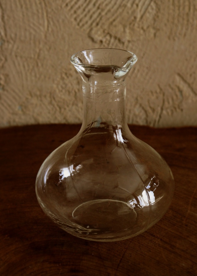 ゆらゆらしたガラスの風合いが魅力的なガラスの徳利です。冷酒や一輪挿しなど多様にお使いいただけます。縦半分の中心にプレスの線(継ぎ目)がありますが手吹きのようなゆらゆらしたガラスの質感があたたかい優しいガラス器です。経年の擦れや小傷は有りますが、状態は綺麗です。サイズ:100mm×高さ170mm。 徳利のみのお値段です。写真のグラス、お盆は含みません。