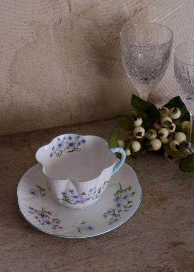 シェリー社ブルーロックシリーズのカップ&ソーサーで1940~1960年代頃の物です。 可愛らしいお花が描かれたブルーロックシリーズで、 イギリスシェリー社は残念ながら1966年に閉窯となってしまいましたが、現在も世界中に多くのコレクターがいるブランドです。 ディンティーシェイプとは ローランド・モーリスにより考案されたスタイルで優美なを意味し,多くのシェリー社の作品に用いられました。ふわっとした質感にお花の形をしたディンティーシェイプが可愛らしいカップ&ソーサーです。 カップサイズ:90×105×H60mm ソーサー直径:143×H20mm