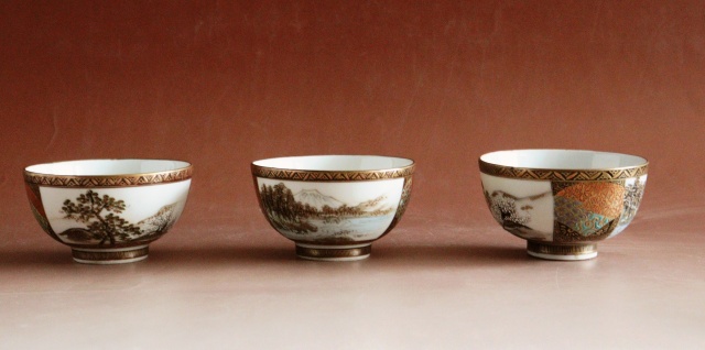 諸所に装飾された高盛りの金彩に美しい富士山の図柄でしょうか、明治期九谷焼の最高潮時の作品で洋食器のような華やかさを持ちながら日本画の構図のような古典的な構成でデザインされた素晴らしい煎茶セットです。輸出向けに作られたものと思われます。落ち着いた金彩がより高級感と華やかさを引き立てます。煎茶以外にも湯冷ましはクリーマなどに茶碗は小鉢や向付としてもお使い頂けます。経年経過の風合いや小傷、湯冷ましの外面、高台に貫入がありますがお使いいただくのに問題ありません。 サイズ:急須105×120×高さ80mm(蓋摘み上まで) 湯冷まし105×88×高さ60mm 茶碗 直径80mm×高さ45mm 3客。 写真の茶托やお盆は含まれません。