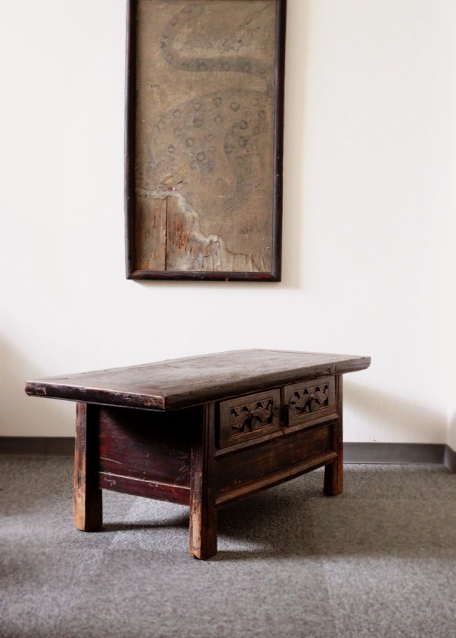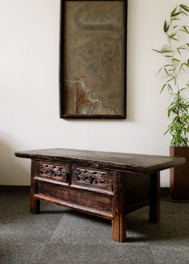 引き出しの彫刻が魅力的で経年経過の味わい深いアンティークの風合いに魅了される素晴らしい李朝家具です。しっかりと厚みのある材に李朝特有の軟らかくもダイナミックな生き生きとした彫刻の引き出しに、末広がりの脚がしっかりした造りで床の間や玄関はもちろん、ソファー前にローテーブルのようにお使いいただけます。 アンティークの為、木割れ、傷、色むら、シミ、虫食い跡、引き出しにゆるみ等ございます。 サイズ:横幅1050×奥行440×高さ400mm 引き出し内サイズ:横幅255mm×奥行250mm×深さ95mm。ブラウザの環境により色合いが多少違って見える場合がございます。送料込みのお値段で、ヤマト家財便200サイズの配送料が含まれたお値段です。 お届け希望時間を午前中.12-15時、15-18時、18-21時の中よりお選びになり備考欄へご記入ください。地域により時間指定ができない場所もございますので予めご了承下さい。
