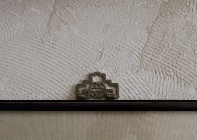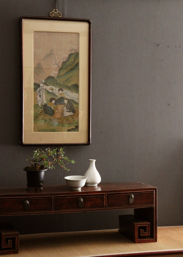 韓国の民画です。伝統的な遊びのユンノリをしているところでしょうか。額の金具もおしゃれな透かしパーツがつき漆塗りの曲面ある額縁が絵をより魅力的に引き立て、まるで室内から窓の外の風景を一緒に楽しんでいるような世界観に包まれます。表情豊かに描かれ青々とした新緑と桜の風景が素朴で穏やかな景色に優しく心安らぐ絵画ですが、何かしらの謎かけの意味合いも含まれた作品かもしれません。深く探る楽しみもある興味深い一枚ではないでしょうか。 民画とは朝鮮の庶民の実用的な民俗絵画で、結婚や還暦などの儀礼、装飾、魔よけ、開運などの実用的な目的のために屏風や掛軸にして、壁に貼るなどして用いられてきました。額サイズ:355mm×630mm(+金具40mm)総計670mm×厚み30mm。内寸横220mm×高さ480mm 表面はガラスです。 ※アンティークの為経過年数によるシミ、額縁の傷や裏面の痛みや変色、補修跡があります。