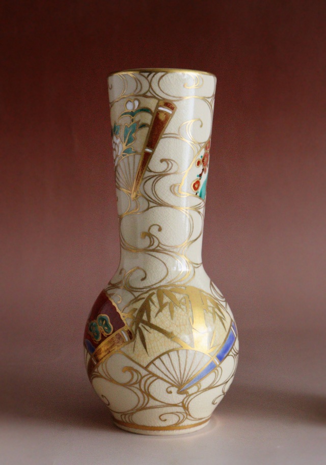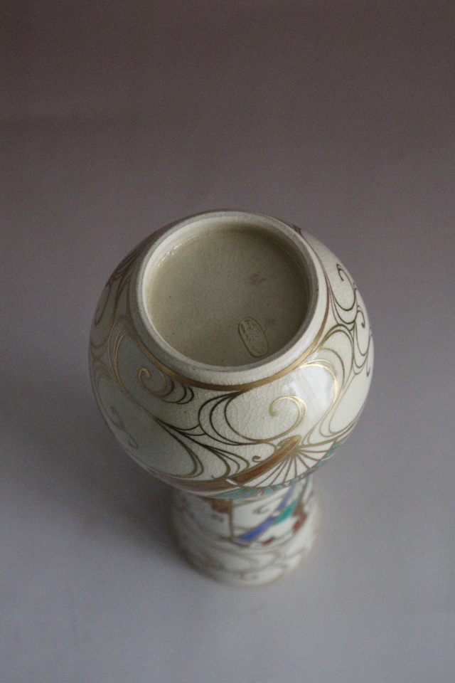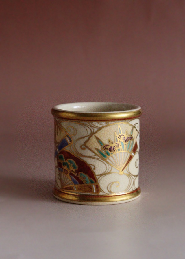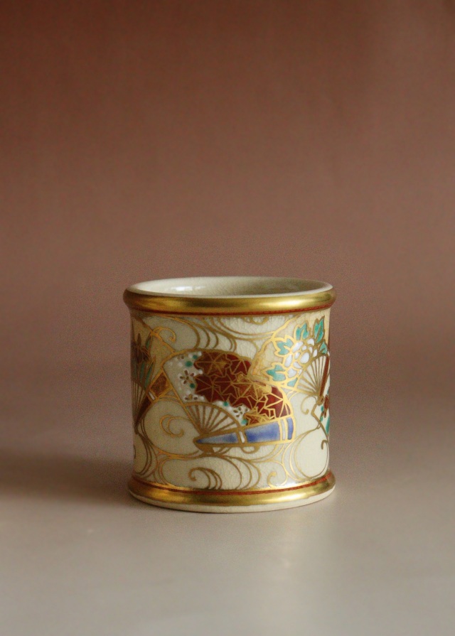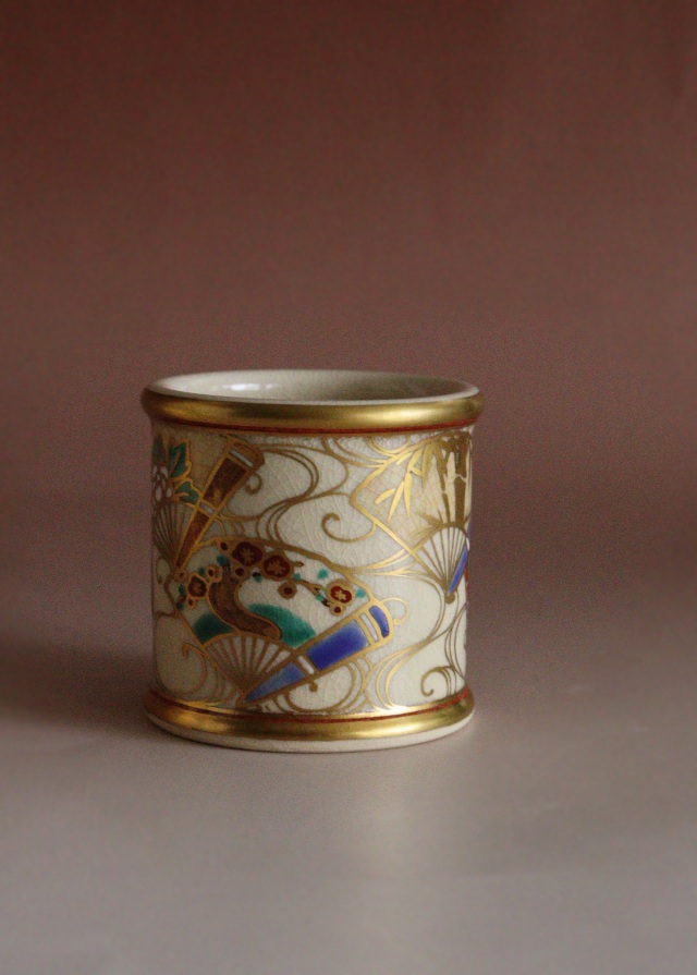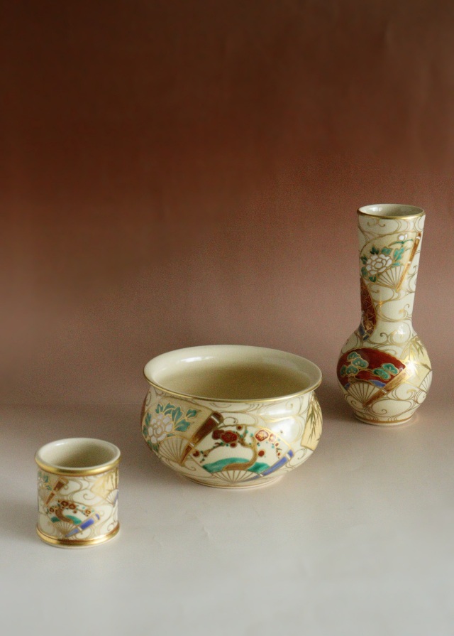 金彩と色絵が雅で綺麗な清閑寺窯の杉田祥平作 京焼皆具 茶道具共箱。 茶道具 サイズ:水指直径180×高さ185mm 建水直径143×85mm 蓋置直径60×高さ60mm 杓立直径80×高さ190mm 時代経過による風合いや、貫入、水指に多少金彩が薄くなっている箇所や内側のみのニュウがございますがご使用いただくのに問題ありません。箱にシミ傷あり。 共布、作家栞はありません。杉田祥平 3代(清閑寺窯) (すぎた しょうへい、1914年(大正3)~2000年(平成12)) 京都府出身。 代々、伝統的な清水焼の技術を継承する。2代杉田祥平(龍斎)に師事。 その作風は色絵、色絵金彩等の仁清写し、染付、交趾などを得意とし、主に茶陶を主流とする。 三千家からの信頼も厚く、「色絵扇面草花流水画茶碗:裏千家鵬雲斎家元書付」などが 代表作として知られる。 4代(当代)昭和17年父3代祥平に師事。1999年(平成11年)4代祥平を襲名。