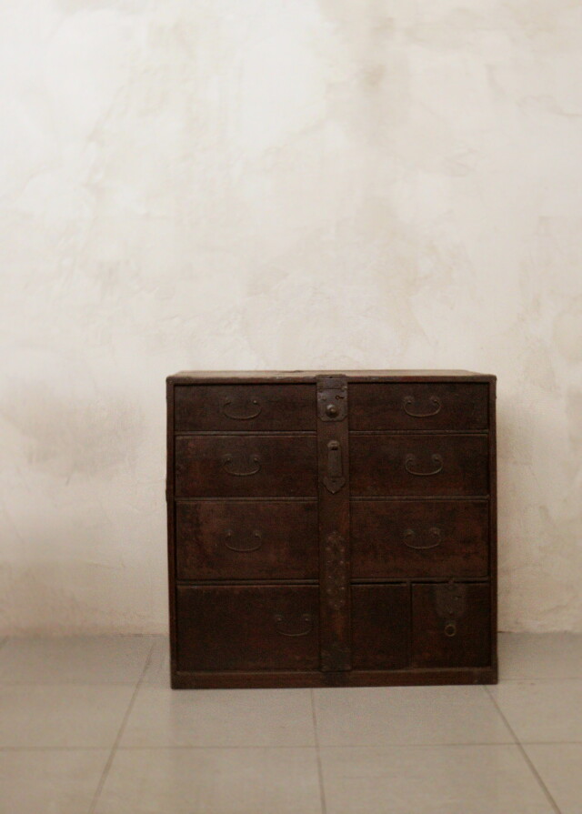 江戸から明治期頃の和箪笥です。中心に棒が入りそれを外すと引き出しが出ます。小ぶりなサイズと経年経過の風合いがとても魅力的な小箪笥です。引き出しの中は和紙が貼ってあります。鍵は中心の棒箇所のみ使用可能。開閉方法の説明文を同梱しお送りしますが年代物の為、開閉しずらい場合もございます。サイズ: 幅575mm×奥行300×高さ542mm。時代経過による木割れ、擦れ、傷などございます。 こちらの商品はヤマト便(約180サイズ)の配送費、梱包料が含まれたお値段です。玄関先でのお渡しとなりますので開封、設置はお客様にてお願い申し上げます。 引き出し内寸 1段目横530mm×奥行260mm×深さ75mm 二段目横530mm×奥行260mm×深さ100mm 三段目横530mm×奥行260mm×深さ130mm 四段目向かって左横360mm×奥行260mm×深さ140mm 向かって右子引き出し横120mm×奥行260mm×深さ140mm(鍵は使用できません)。