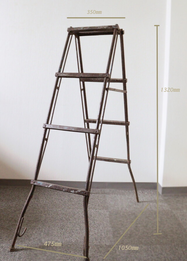 味わいの良いアイアン製の古い三脚です。ビンテージ、インダストリアル、ガーデニング等お好きな方におすすめです。間に板をのせ棚としてもご利用いただけます。布を飾ってもいいですね。アンティークの為、梯子としてのご使用は保証いたしかねます。あくまでもディスプレイ用品としての販売とさせて頂きます。 沖縄県への発送はできません。代金引換はできませんので予めご了承ください。 閉じた時のサイズ:470mm(下脚部)×高さ1420mm×奥行140mm