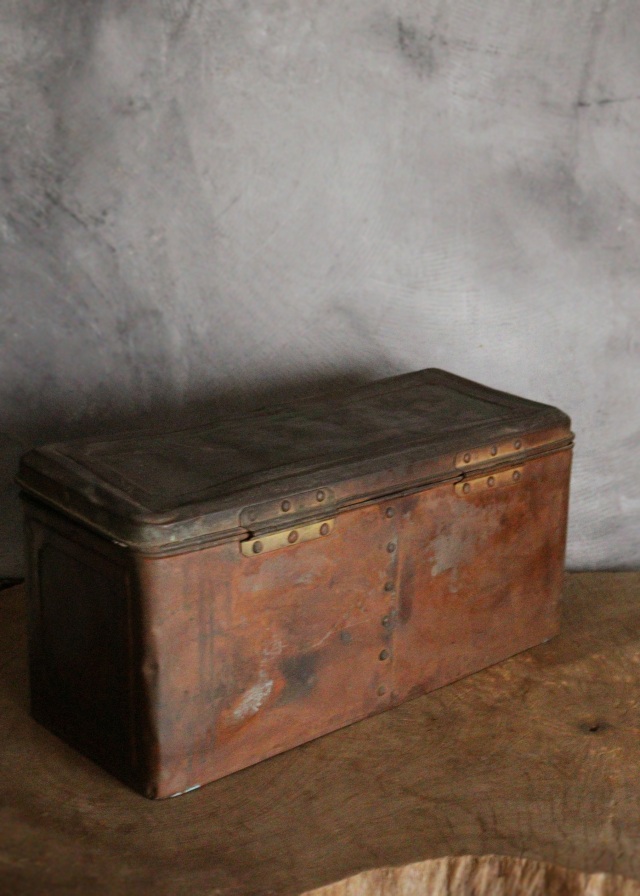 古い味わいの良い古い缶で椿油を入れたものです。中には四つの仕切り缶が入り、口径は約6cmで蓋は置くだけの状態です。アルミのじょうご(ロート)が一点ついています。古いものですので、凹凸や汚れ、歪みなどありますが古いものの味わいとしてお楽しみください。蓋の閉まりに多少浮きがあり、蓋裏のネームホルダーに緩みがあります。 サイズ:横幅460×奥行き205×高さ220mm 中の仕切り缶サイズ:蓋穴直径60mm 横幅110×奥行き180mm 高さ175mm。