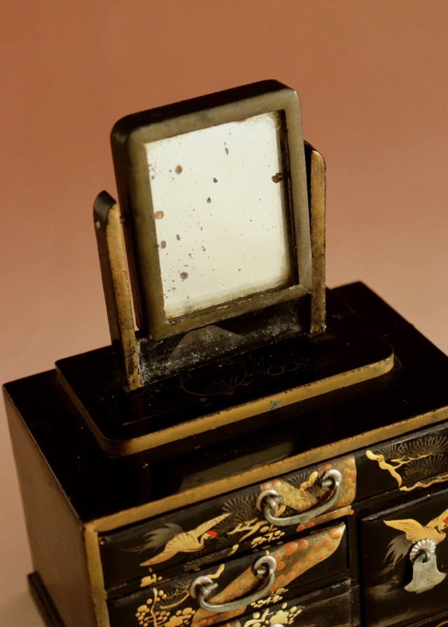 優しい蒔絵が描かれた雛道具のセットで三ッ揃(箪笥・長持ち・狭箱)三点と鏡台と裁縫道具です。 古いお雛様に合わせていかがでしょうか。経年経過の風合い、小傷はございます。大正~昭和初期頃。木製品。 タンスサイズ:横10.5cm×4.8cm×高さ11.5cm(4段)長持ち:横12.5cm×奥行5.6cm×高さ63cm 狭箱2個:横5.3cm×奥行3.8cm×高さ4cm (箪笥・長持ち・狭箱2個で御三ッ揃) 鏡台:横幅8cm×5cm×高さ10.5cm 裁縫箱:5cm×5.2cm×高さ9.5cm 。ブラウザの環境により色合いが違って見える場合もございます。