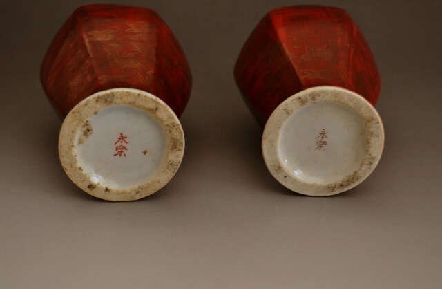九谷永楽窯1対の小さな花瓶です。朱赤の地に金襴手の雲鶴の紋様が描かれています。小さなサイズでありながらあたたかみのある優しい印象です。古いものがお好きな方におすすめです。サイズ:75mm×75mm×高さ125。九谷永楽窯-加賀国江沼郡山代村(石川県加賀市)に来た二代永楽和全の窯の事で安政文久(1854-64)の間に山城山の宮本窯が廃業した時大聖寺藩は三藤文次郎に管理させ、1866年に京より和全と弟子の西村宗三郎を招きました。金襴手・呉須赤・安南・絵高麗・染付などから和全特有の紗文手・交趾に至るものを製造しました。 箱はありません。経年経過の風合いや釉薬の剥がれがございます。内側経年の汚れがありますが、時代物の証明としてそのままの状態でお送りします。