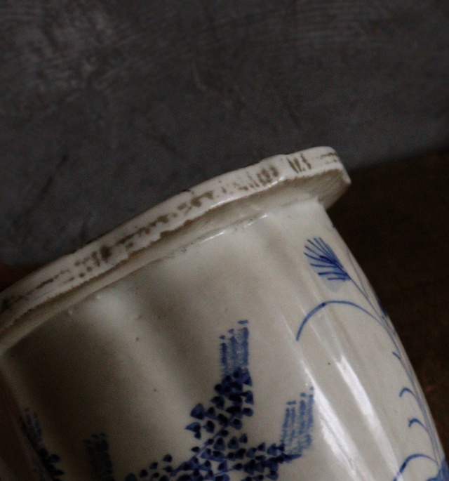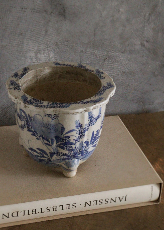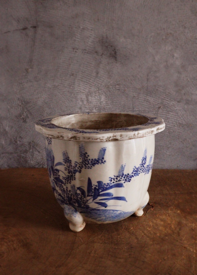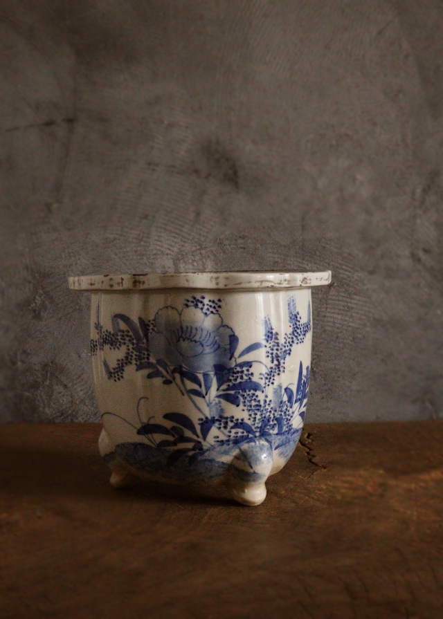 江戸時代には尾張藩のお庭焼として有名な尾張焼(瀬戸焼)の歴史は古く、安土桃山時代の前より栄えた焼き物で愛知県瀬戸市を中心に作られました。 三つ足に胴には鎬が入り花輪郭の縁も上品で手書きで描かれた花々も優しく生けるものを引き立てる植木鉢(盆栽鉢)です。 穴を塞ぎ、手あぶりで楽しむのもいいですね。 幕末から明治時代。 経年経の風合いや小傷、擦れや時代汚れがございます。。箱はありません。サイズ:215×215×高さ170mm