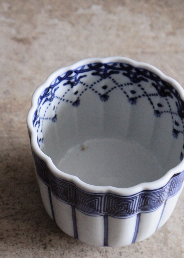 内側に丁寧に描かれた瓔珞紋様美しく花輪郭の優しい形状に外面は桶川紋様を染付で描いた火入です。綺麗な状態ですので和食器としてご使用も頂けます。深い藍の色味に上品さと愛らしさもあり見ているだけでも心が豊かになる優しい風合いです。やや大きめな印象です。 サイズ:97×102×85mm 経年の小傷、窯傷、一客の見込みに窯傷がございます。2客組のお値段です。江戸時代。古伊万里。