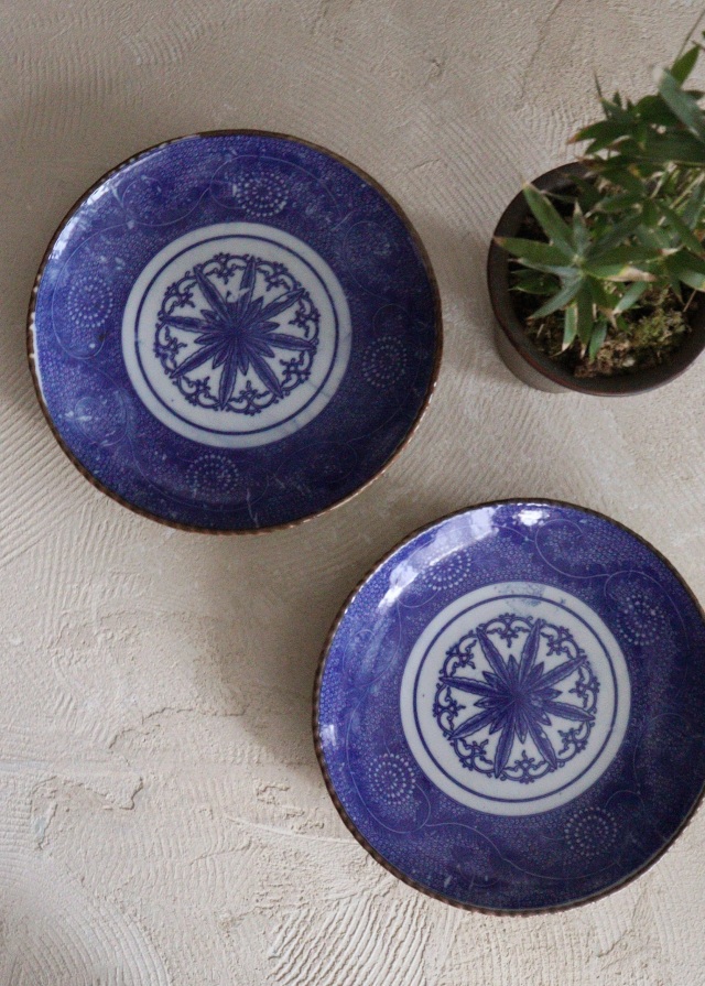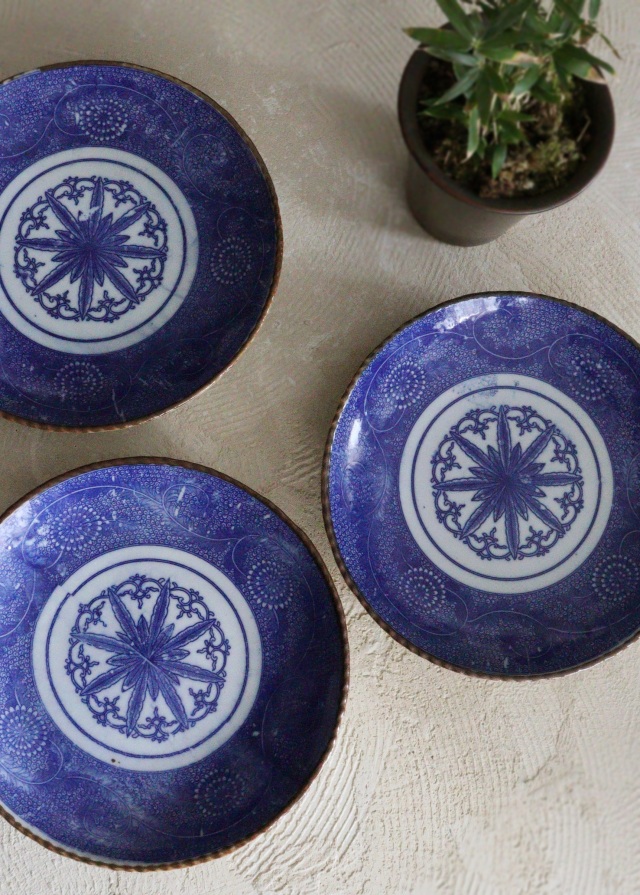 洋風な柄の印判皿で、和食と洋食両方に合うお皿です。イゲ皿とは縁にかけギザギザと紋様をつけ、鉄釉をかけたお皿です。経年経過の落ちにくい汚れや擦れ、傷、窯傷や高台傷、印判特有の印判ずれがございます。一枚一枚状態や色合いに違いがあります。 サイズ:直径240mm×高さ40mm。明治時代。1枚のお値段です。