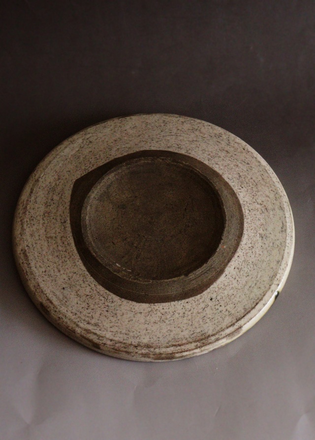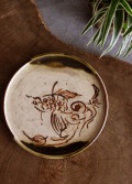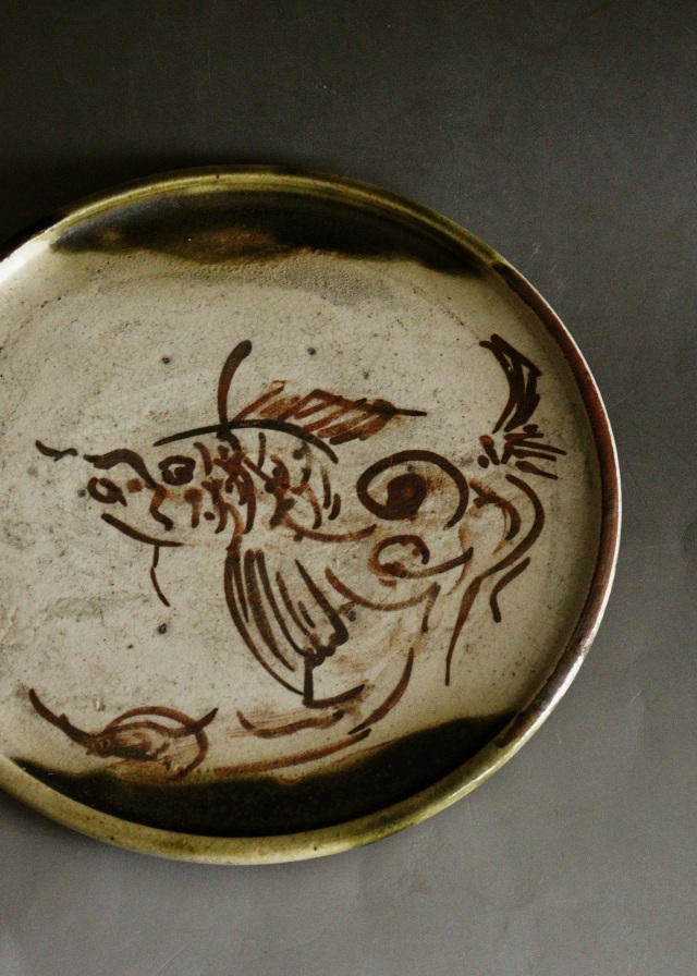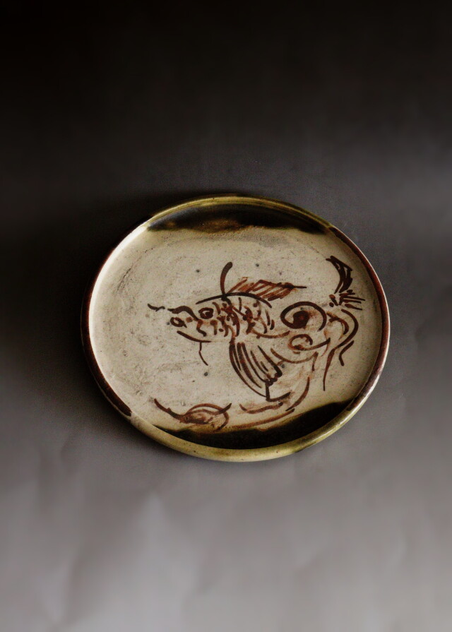 江戸時代の織部の行灯皿です。 手書きの金魚の図柄は行灯皿の円形を水槽に見立てたようなデザインで水中を気持ちよく泳ぐゆるやかで優しい図柄の大変希少な織部皿です。酒器の盆としても、茶器の茶盤や盆など民藝の雰囲気のお好きな方にお薦めです。※傷、割れがございます。 行灯皿(あんどんざら)は、行燈に用いた油用の受け皿のことで油差しを載せる台として使われました。 サイズ:215×215×高さ25mm 経年経過の風合いはありますが大きな傷なく素晴らしい逸品です。