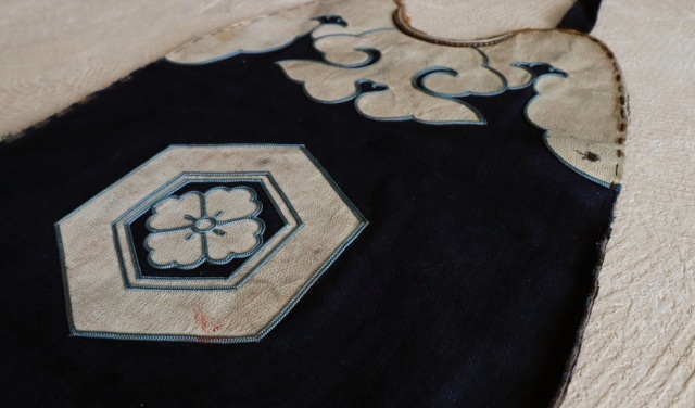 江戸時代の希少な火事装束の一部です。火事装束とは火消が火事の際に着用した衣装の事で武家火消は羽織・胸当て・野袴を着用し、町火消は刺子の羽織や股引などを着用しました。こちらは武家火消の胸当てで藍色と白のコントラスト美しいデザインに丁寧な刺繍で縁取りしたシンプルでありながら品の良く、保存状態も比較的良いのでコレクションはもちろん、タペストリーや額装仕立てにして飾るのもよろしいかと思います。 サイズ:横幅280mm(+紐60mm左右)×縦570mm(全体830mm)。 全体的に経年経過の風合いや痛み、シミ等あります。箱はありません。