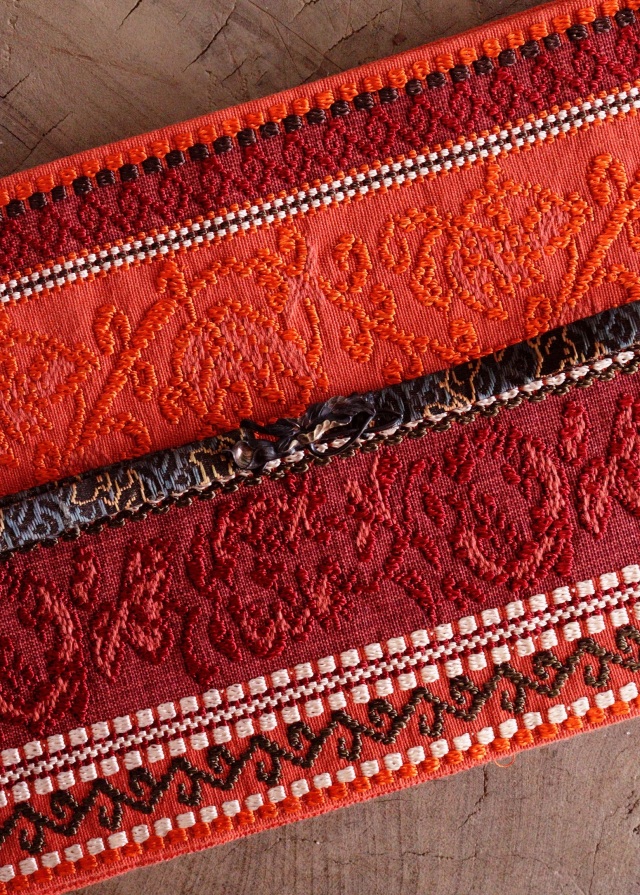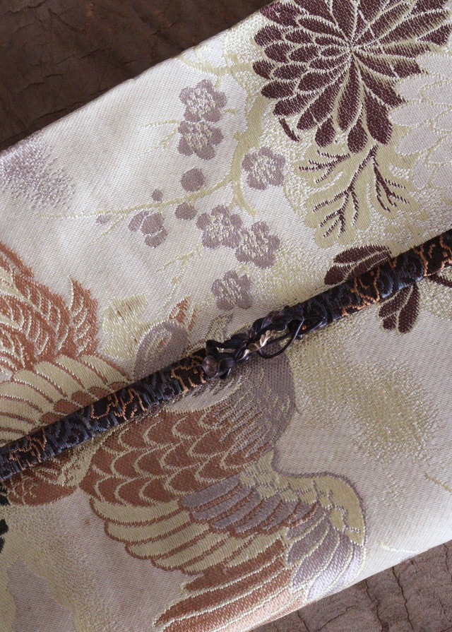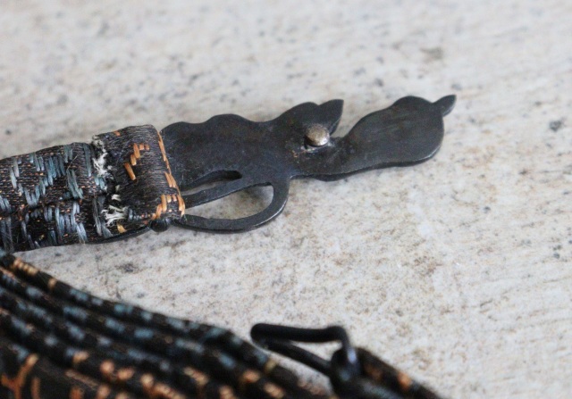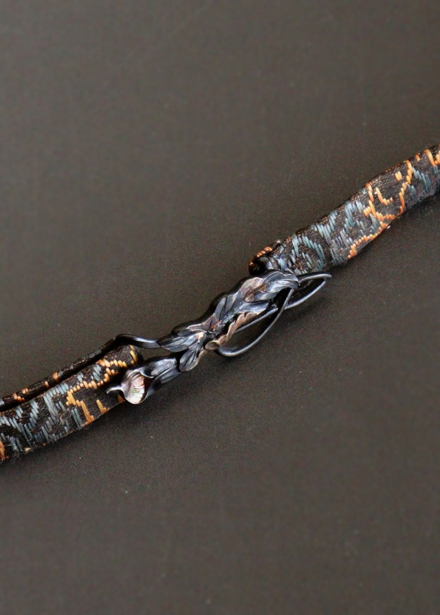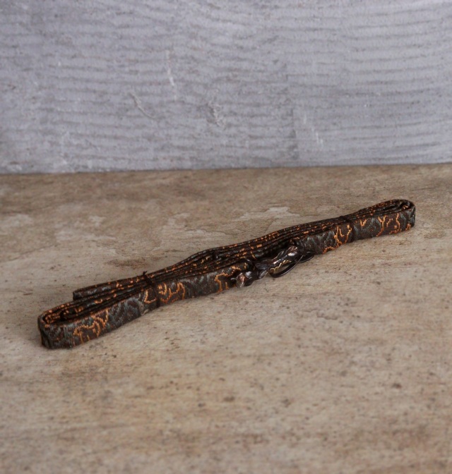 曲線が綺麗な美しい帯留めです。帯地で仕立てた帯締め付きで、柄は波に千鳥紋様です。帯締め幅約9mm。帯締めに経年の擦れや風合いがあります。江戸幕末ごろ芸者衆の間で帯留が大流行し、男性の刀の小柄、目貫、柄頭などの刀装具や煙草入れなどを契りの証しとして帯留に作り替え用いられていました。帯留サイズ40mm×厚み2mm×高さ15mm。帯締め・帯留めを含む長さ最長約1m 1m以内は調整可能。経年経過の風合いがあります。