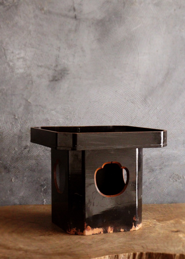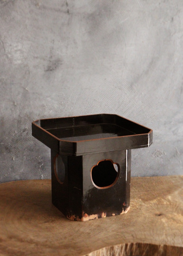 三方は神仏に供え物をのせる台とする用途ですが、盆栽台や茶器台、お月見やお正月、仏像を飾る台など多様にお使いいただけます。江戸時代のものですので味わい深い景色と情緒ある雰囲気が古い物がお好きな方にはたまらない一点ではないでしょうか。サイズ:295×295×高260mm。経年経過の擦れや漆剥がれがあります。