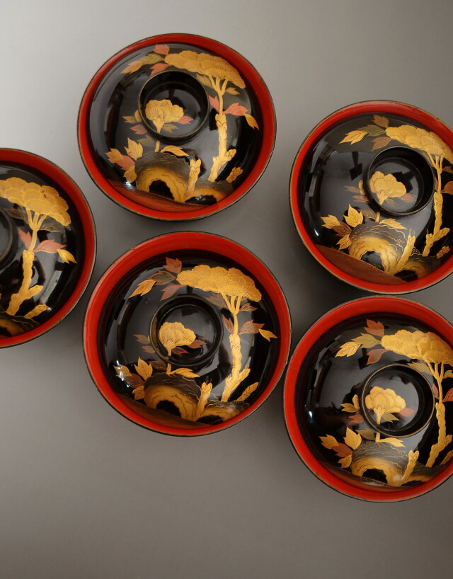| 製品名: | 時代蒔絵椀 5客組 牡丹紋様縁起物 |