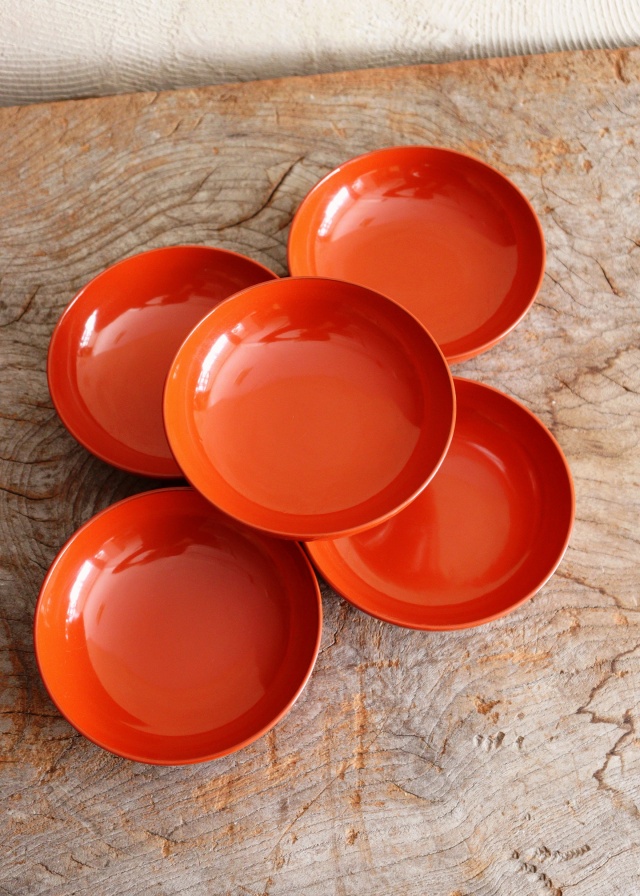 朱漆鮮やかなシンプルな小皿です。お漬物やコースターなど幅広く使いやすいサイズで五枚組のお値段です。サイズ:直径116×高さ38mm 経年経過の風合いや擦れ等ございます。
