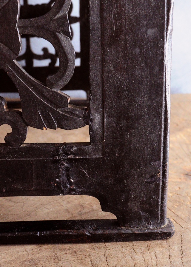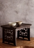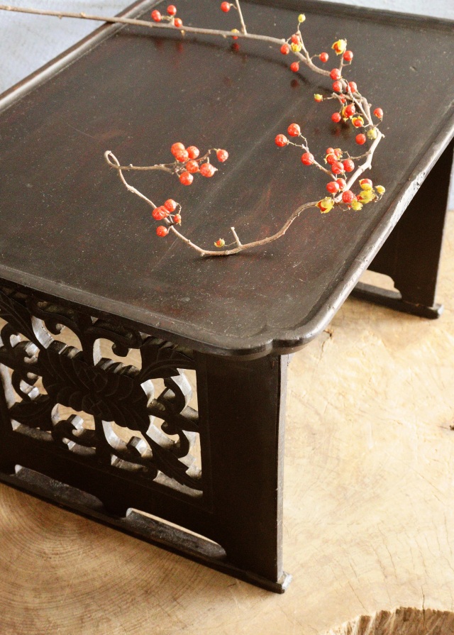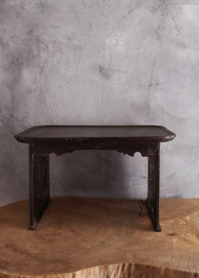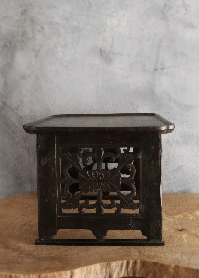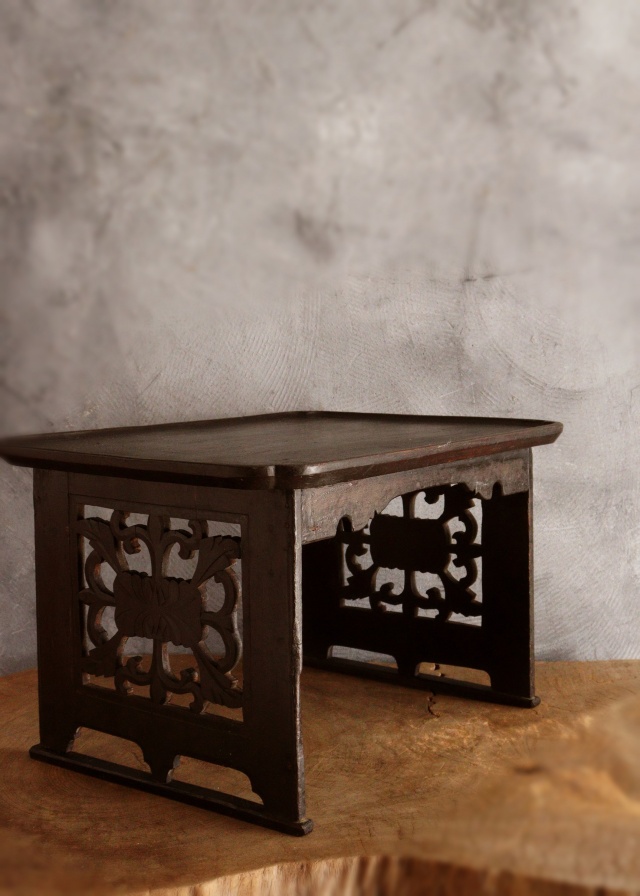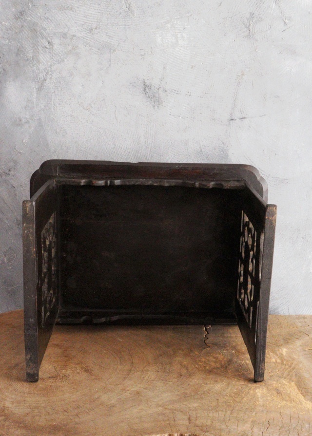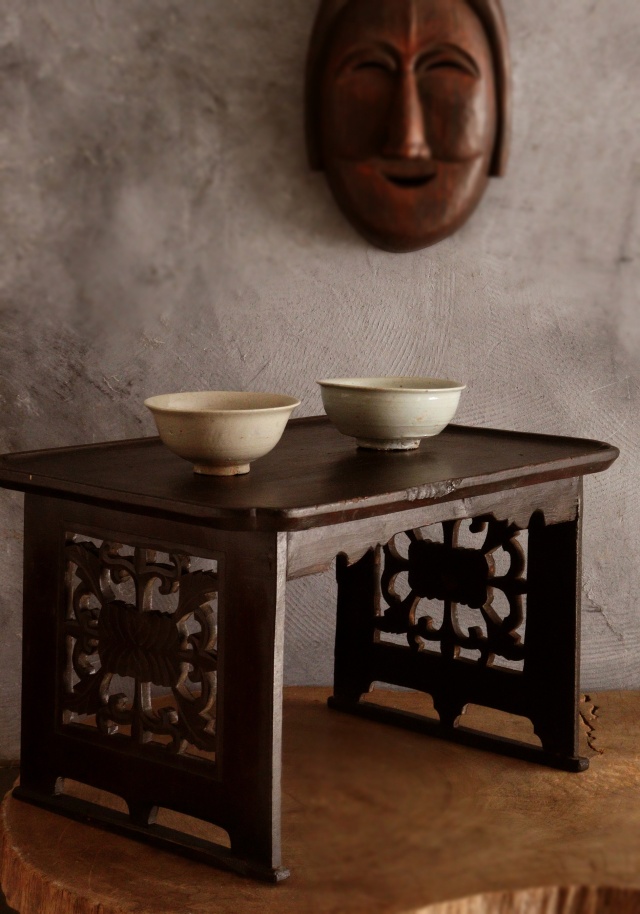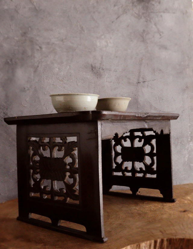 アンティークの韓国のお膳です。こちらは黄海道海州地方で作られた海州盤(ヘジュバン)と呼ばれるスタイルです。側面が丁寧に彫られた透かし彫りに味わい良く品の良いデザインの李朝膳です。古いものですので時代経過による傷、スレ、木割れ、反り、経年の修復跡がございますが古い木の風合いがお好きな方におすすめです。構造上少しカタツキがありますが薄いフェルトなど底脚部にご使用いただけましたら安定します。李朝膳のみのお値段です。上にのせた陶磁器類は価格に含まれませんサイズ:横470×奥行340×高さ277mm。