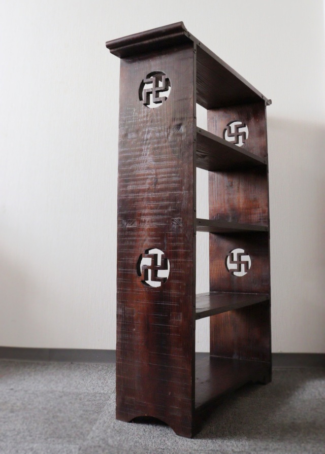 筆返しの天板と側面の卍文様の透かしが魅力的なシンプルデザインの韓国家具の本棚・飾り棚です。 奥行がないのですっきりとお部屋を飾ってくれる使い勝手の良い万能な棚です。無垢板を使用していますので重厚感を感じて頂けると同時にお使い頂くたびに愛着が湧き、木の風合いを楽しんで頂けます。 本物志向の方におすすめな商品です。こちらの商品は1990年頃のもので、経年経過による風合いや擦れや傷や木割れ、若干の木の反りはございますが、しっかりと臍組で作られているのでとても丈夫で長くお使い頂けます。コレクションを飾る飾り棚として又は棚板がしっかりしてますので本棚としても最適です。左側面のダイナミックなノミ跡も魅了的な風合いです。 前面のみ金具がついています。 サイズ:横幅925mm(棚部幅外750mm内705mm)×奥行300mm×高さ(筆返し上1310mm)(天板1300mm)一段の棚の高さ約280mm。 こちらはヤマト家財便250~200サイズの送料が含まれたお値段です。沖縄県、その他の離島の場合、別途手数料がかかりますのであらかじめご了承ください。 )ブラウザの環境により色合いが多少違って見える場合がございます。 ヤマト家財便にて発送致します。お届け希望時間を午前中.12-15時、15-18時、18-21時の中よりお選びになり備考欄へご記入ください。地域により時間指定ができない場所もございますので予めご了承下さい。ご指定日はご注文より7日以降で御願い致します。