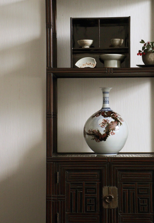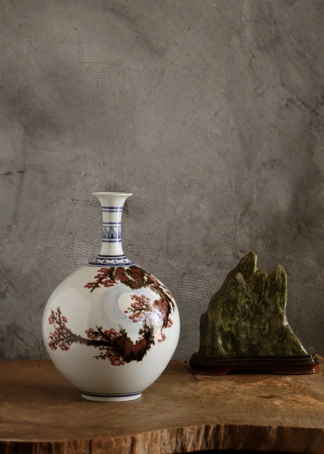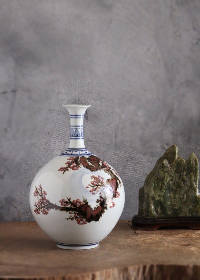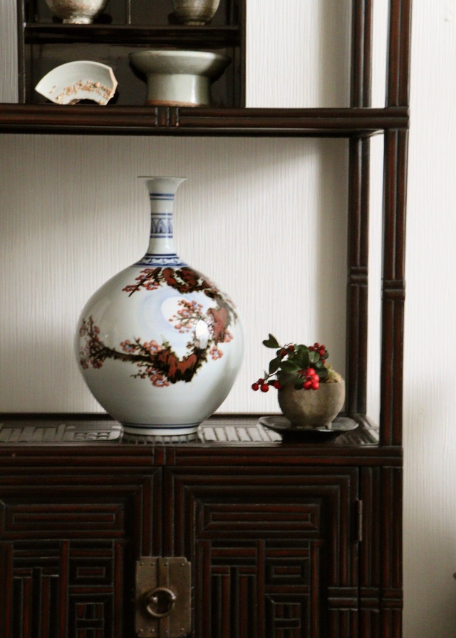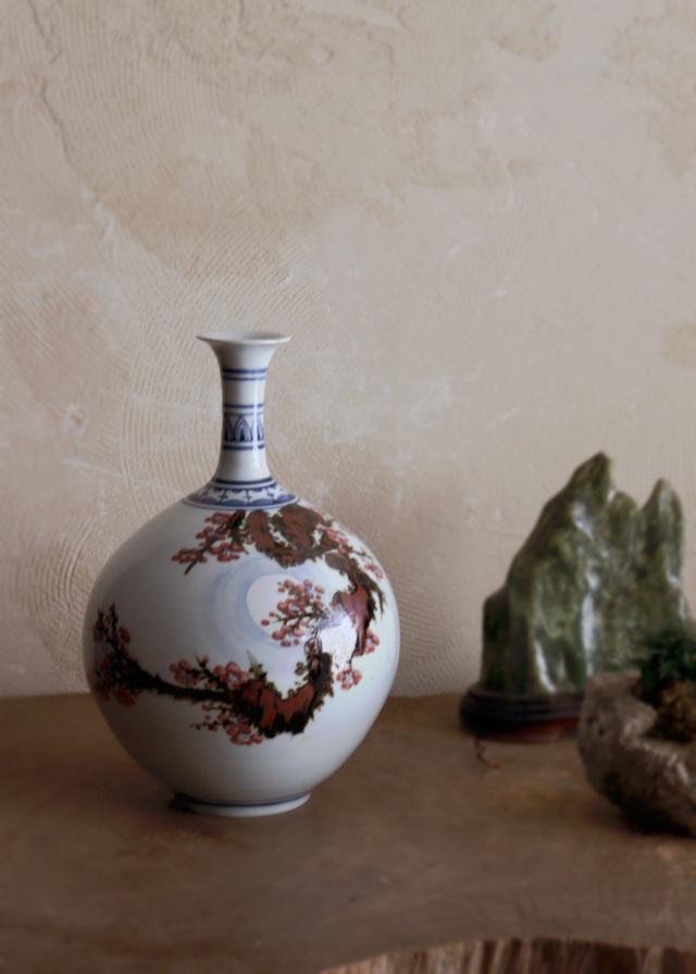 ふっくら満月のように丸い胴に細く品の良い頚が付き、美しい形状に青華(染付)・辰砂・鉄砂で描かれた、満月の中の梅の木の図が優しく彩ります。韓国人作家の作品です。 泰岩 沈相燮 略歴 1923年驪州((ヨジュ)は大韓民国京畿道の南東部にある市)出生。1971年京畿道驪州東石陶芸設立。 伝統工芸展入選。1982年韓国伝統芸術大賞展入選。 韓国スタイルのインテリア、中国スタイルのインテリアにおすすめです。※箱はありません。サイズ:210×210×高さ320mm 1900年代製。経年の風合、胴の後ろに薄く茶色雨漏りのような風合いがございますがお使いいただくのに問題ありません。