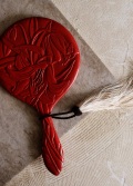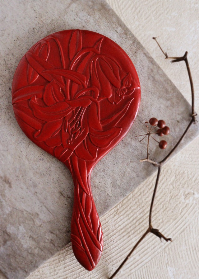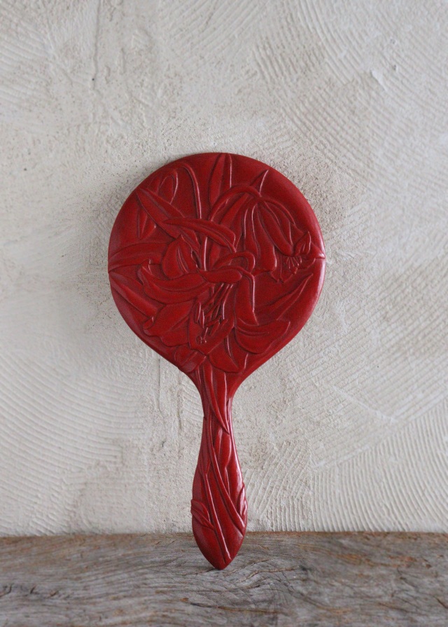 鎌倉彫の大輪のカサブランカが美しく鮮やかな朱色とマットな艶感が上品な手鏡です。サイズ:163mm×全長312×厚み10mmmミラーのサイズ直径143mm。※ミラー部は綺麗な状態でお顔がほっそり見えるミラーです。写真のタッセルは別売りです。 経年の多少の風合いやミラーを固定している縁材に経年の風合いがみられます。箱はありません。