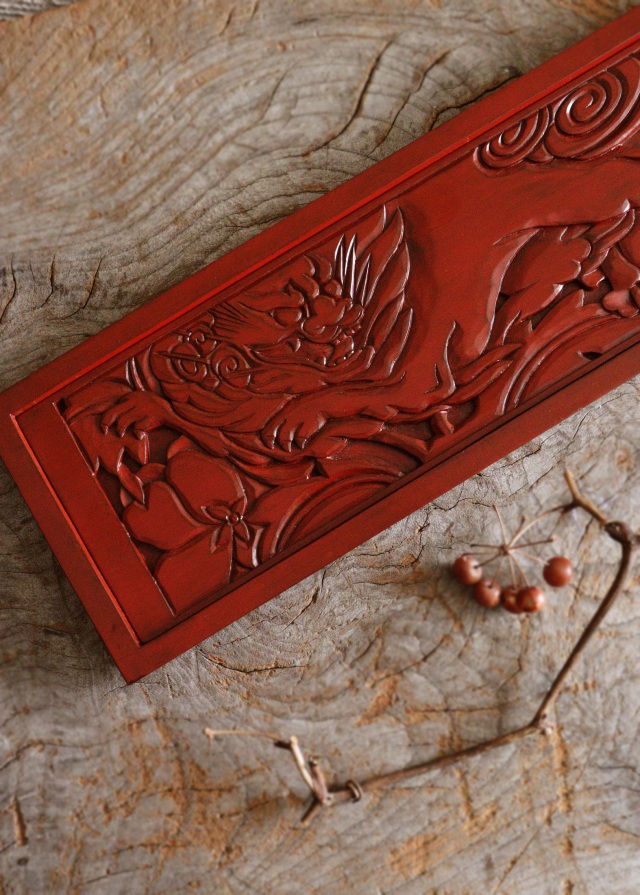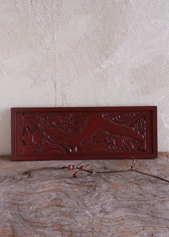 獅子牡丹柄の内側のレリーフと額縁のようにフレームが付き、獅子牡丹の面を下に押すと3mmから5mmの縁ができペン皿やお盆、トレイとしてもご使用いただけます。壁にかけインテリアとしても朱色鮮やかで素敵です。鎌倉彫。サイズ:横335mm×縦120×厚み12mmm。 経年の多少の風合いがみられます。箱はありません。