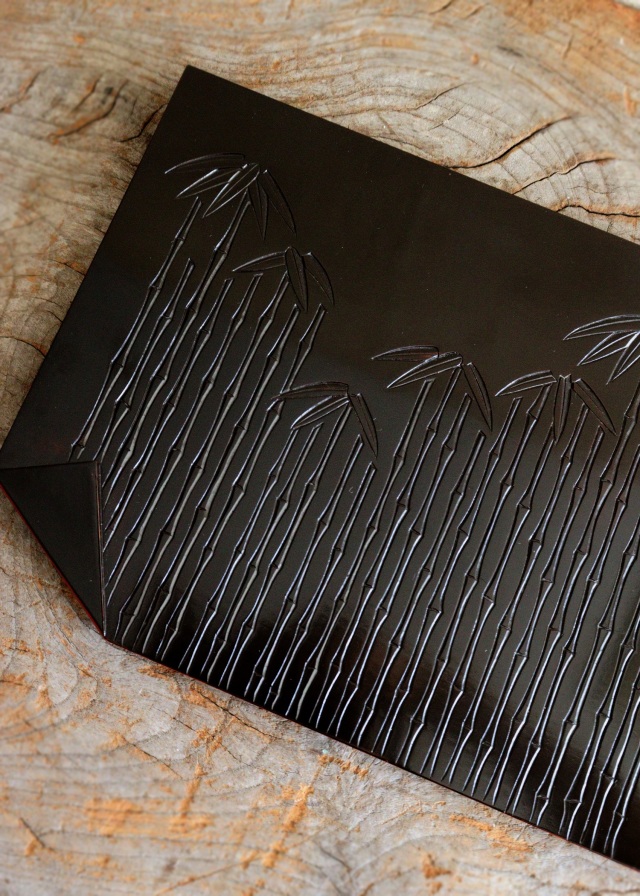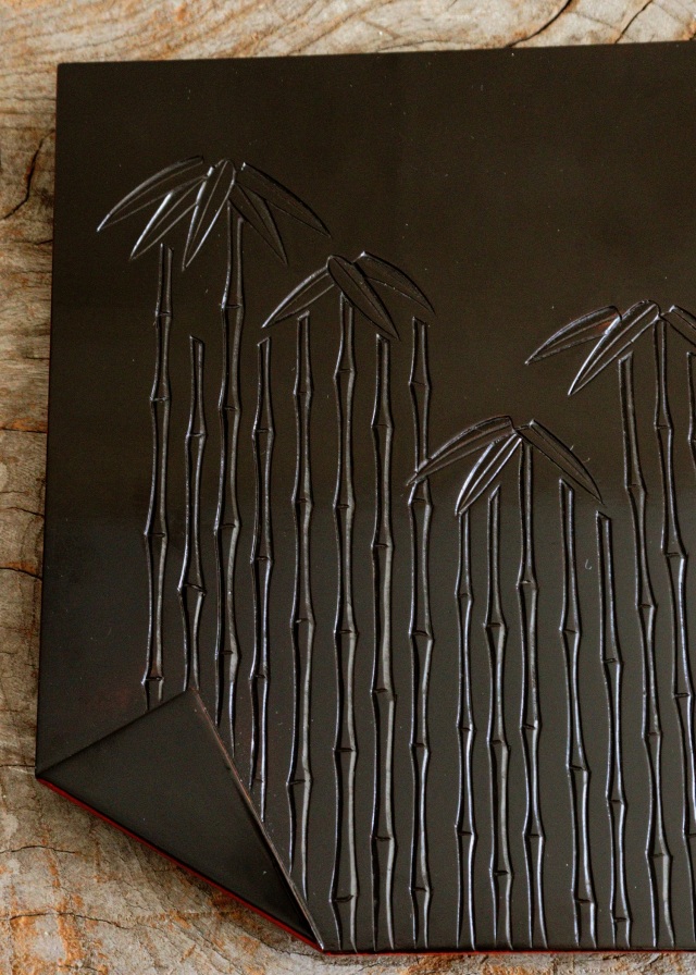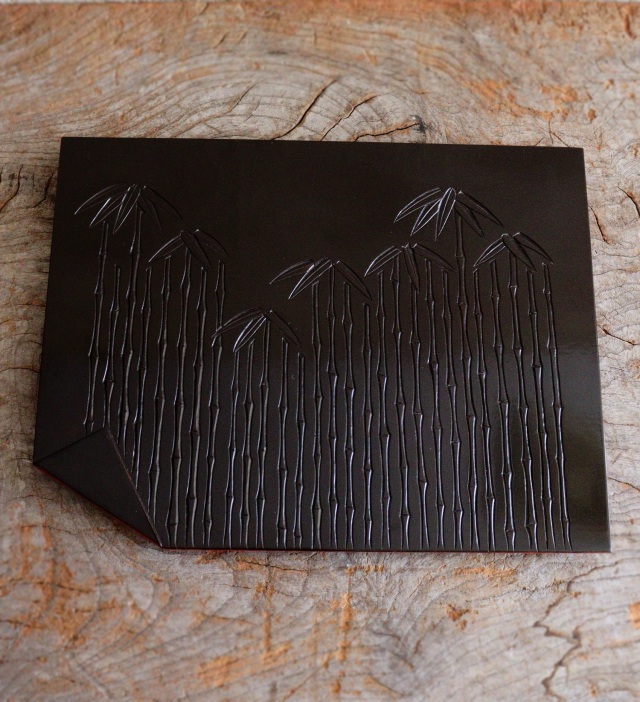 竹林紋様がモダンで美しく、上にのせるものを引き立ててくれるデザインです。和菓子やお料理、ミニ盆栽や香合など幅広く飾り楽しんでいただけるアイテムです。鎌倉彫。サイズ:横270mm×縦210×厚み20mmm。未使用ですが長期保管品の為、 経年経過の風合いがみられます。箱はありません。
