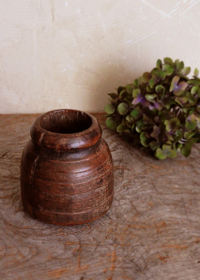 味わいの良い木製の小壺です。縦で真ん中を割り、中をくりぬき最後に左右を合わせた形状です。アンティークの為木割れがございます。 サイズ:105×105×高さ110mm。