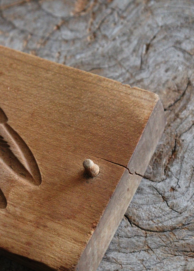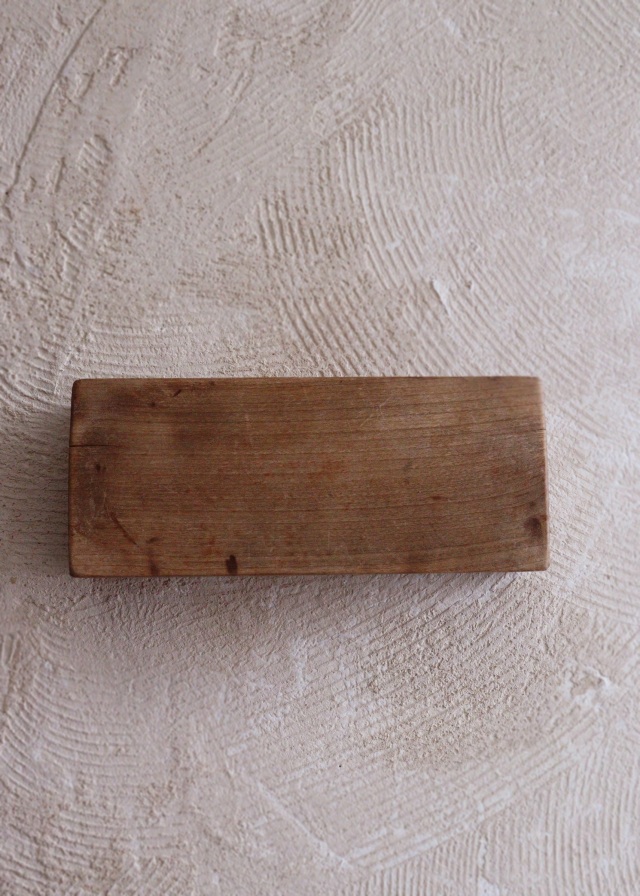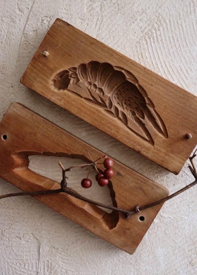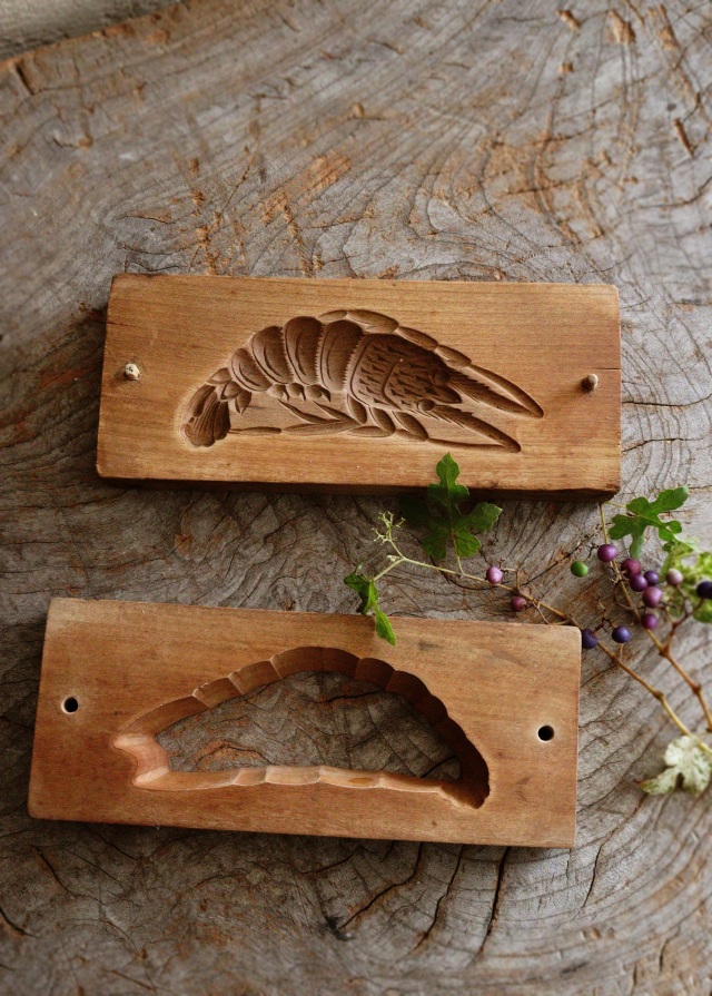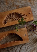 上下ではさむ形状の海老の菓子型です。シャープで繊細に彫刻された海老はデザイン的で美しい模様です。経年の木の風合いも味わい深い魅力的な木型です。木の物がお好きな方にはおすすめな一点です。壁に飾りインテリアにも素敵です。 経年の風合い木割れやシミ、小傷がございます。サイズ:200mm×80mm×厚み44mm(一枚の厚み21mm)。