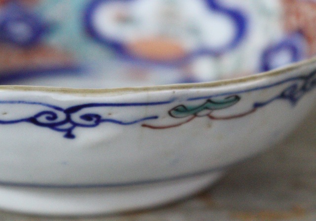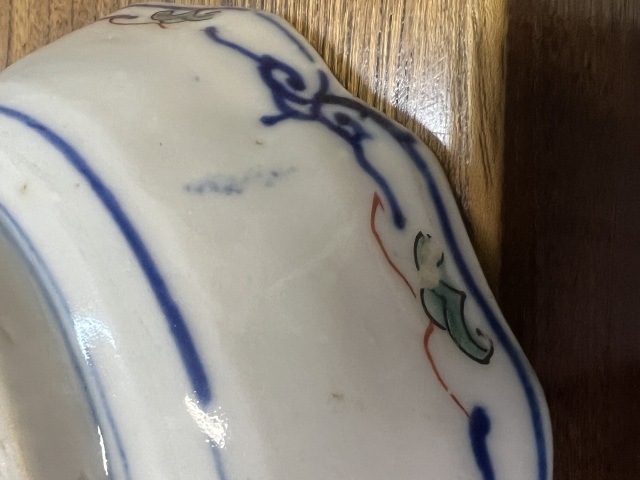 花輪郭の縁が品良く緑の釉薬が多めの配色から大聖寺のような色味にしあがり色絵の中でも珍しい色彩での5枚組のなます皿です。サイズ:155×45mm。 ニュウが一枚あり、ホツや釉薬の剥がれ小傷があるものがございますがお使い頂くのに問題ありません。