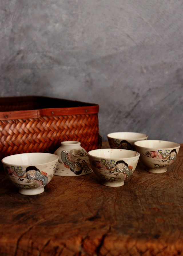 味わいの良い煎茶碗5客組です。珍しい色絵の万古焼で見込は粉引きのような風合いに使い込むほどに雨漏りや貫入などの経年経過の景色を楽しめる茶器です。古金で金直し(金継)補修された景色もまた味わい深さを楽しめます。酒器や茶器、小鉢などにも最適です。5客中4客に金継があります。籠や盆は含まれません。幕末から明治期。経年経過の雨漏りニュウがありますが古いものがお好きな方におすすめです。 直径73mm×高さ42mm 5客組。