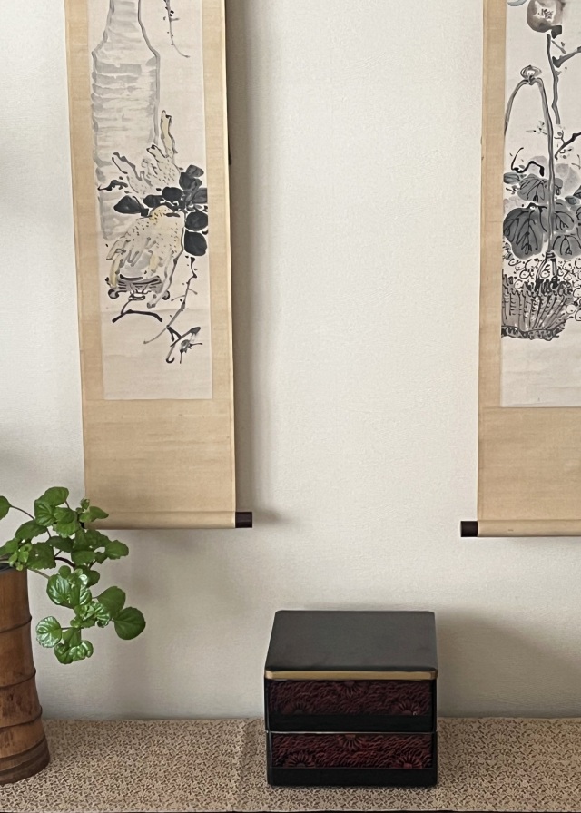 < アンティークサムズコレクション姉妹店 古舫庵コレクション>きんま塗 讃岐漆器 二段重。しっかりとした厚い木地に蒟醤塗(きんまぬり)を施したお重です。蒟醤塗(きんまぬり)とは香川漆芸の代表で、タイ国の植物の実の名称だといわれ、何回も塗り重ねた上にケン(刃)で文様を線彫りしてそのくぼみに色漆を象嵌する技法で、漆の面を彫るという点では、沈金と変わらないようですが、朱漆、黄漆の色ごとに彫りあげ充填させる作業を繰り返し、全部の充填が終わると表面を平らに研ぎ出すといった独特の技法です。昔作りの少し大きめのサイズになります。経年の擦れ、小傷が有ります。サイズ:横240mm縦240mm高さ二段重全体約177mmこちらの商品は姉妹店古舫庵の委託品になりますので発送にお時間を頂く場合があります。