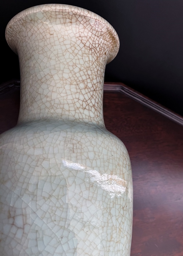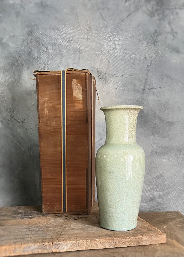 < アンティークサムズコレクション姉妹店 古舫庵コレクション>青磁花器 桐箱付 高さ55cm。高さの有る落ち着いた色合いの青磁の花瓶です。経年の風合いが存在感ある花器です。経年の擦れや小傷は有ります。サイズ:幅120mm高さ550mmこちらの商品は姉妹店古舫庵の委託品になりますので発送にお時間を頂く場合があります。